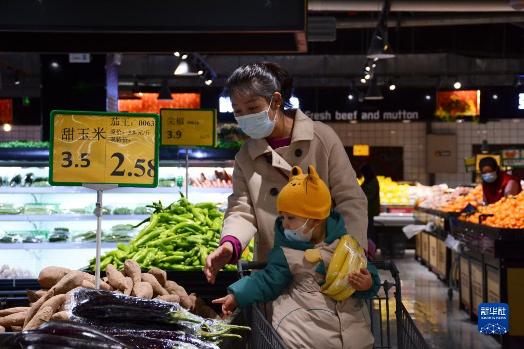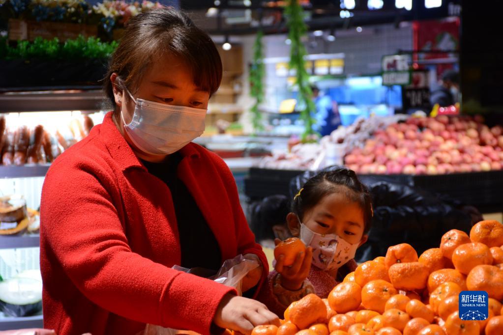 1月10日,在青海省海北藏族自治州门源回族自治县一家超市,市民李林梅带着女儿挑选水果。新华社记者 柳泽兴 摄