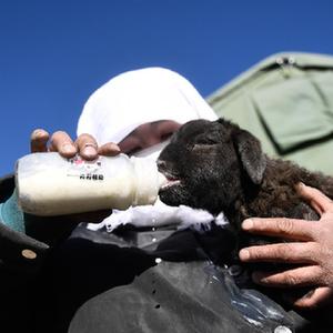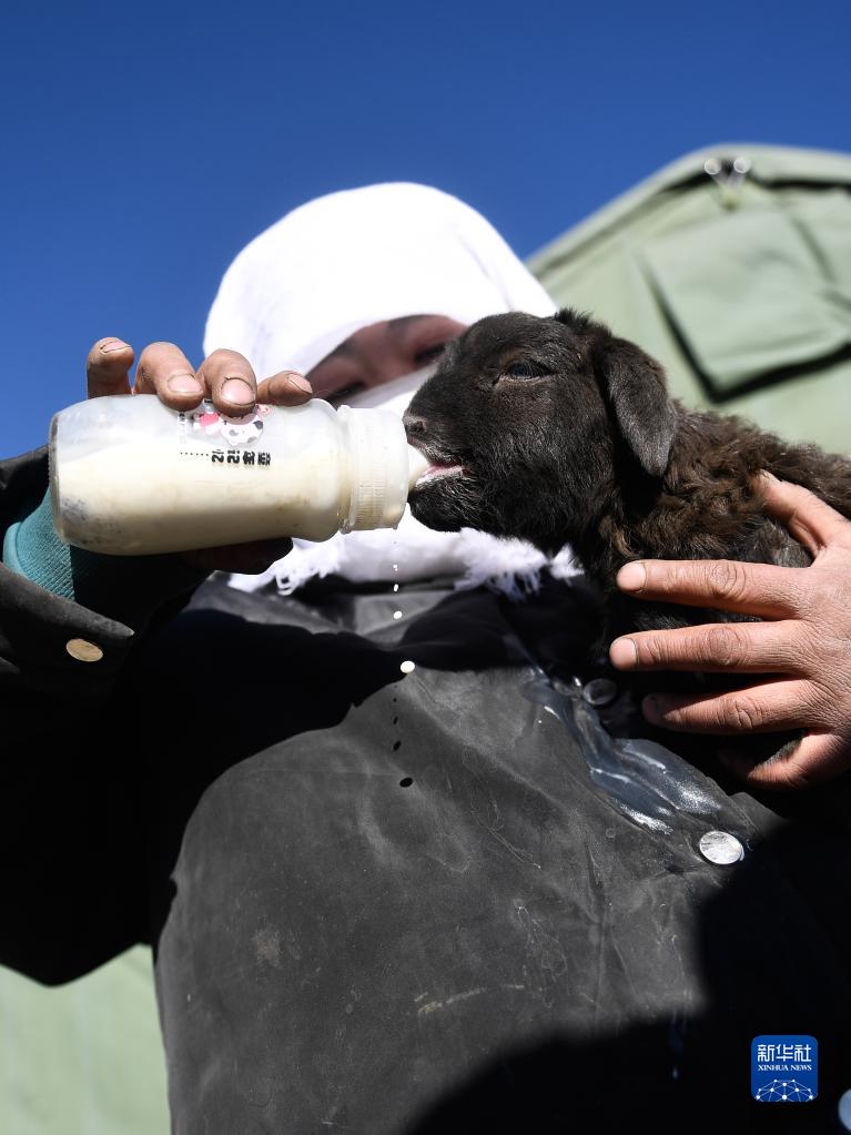 1月10日,在青海省海北藏族自治州门源回族自治县皇城蒙古族乡马营村,牧民贺才姐在给一只羊羔喂奶。新华社记者 张龙 摄