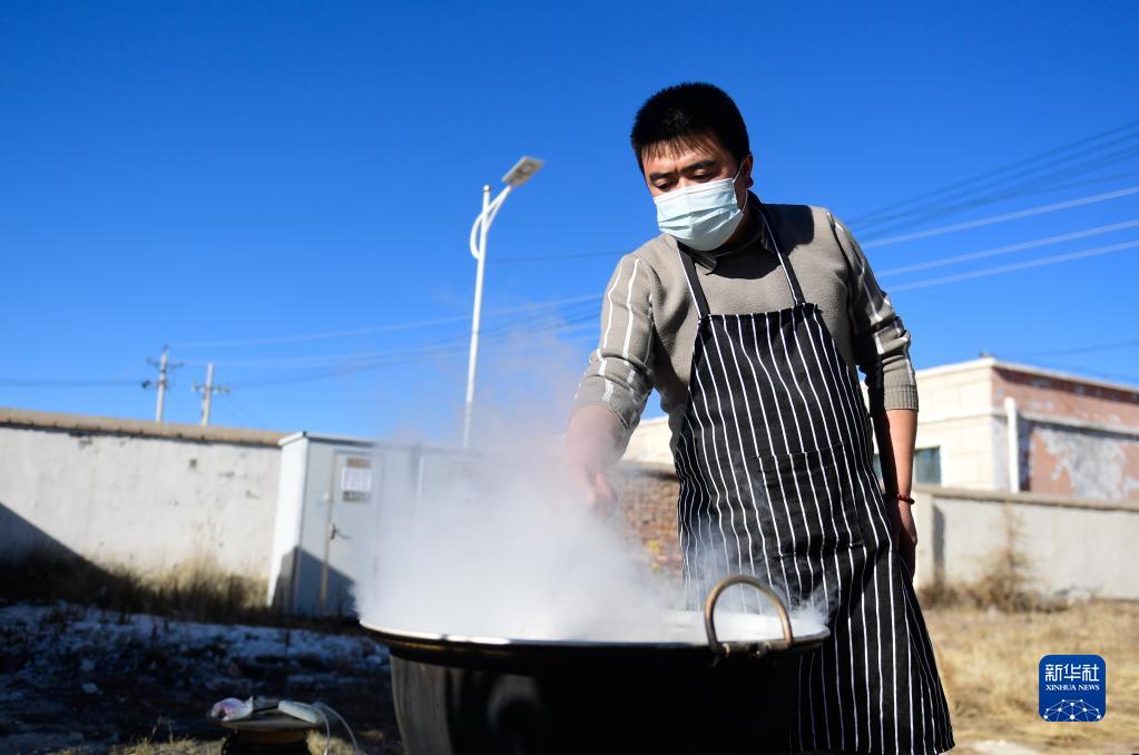 1月10日,在青海省海北藏族自治州门源回族自治县皇城蒙古族乡政府院子里,工作人员在熬制腊八粥。新华社记者 张龙 摄