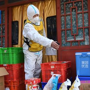 1月11日,“美团优选”的配送员对为一个社区配送点派送的货品进行酒精消杀。新华记者刘潇摄