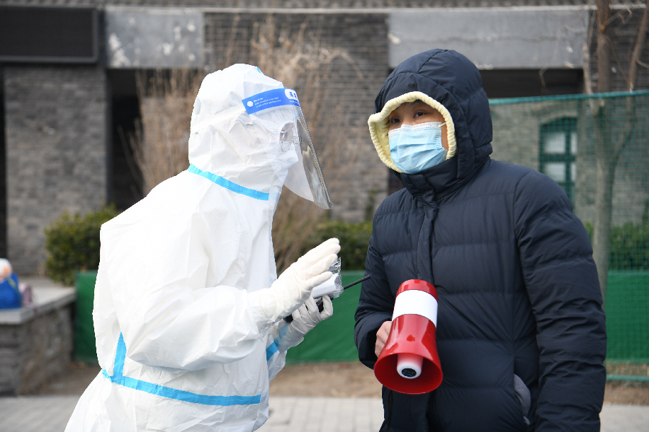 1月9日,在天津市南开区鼓楼街道一核酸检测点,刘佳(右)与医务人员沟通。