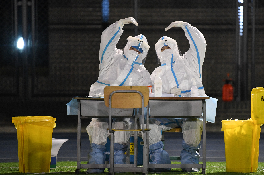 1月10日凌晨,在天津市南开区鼓楼街道中营小学核酸检测点,两名医务人员做出“比心”手势。