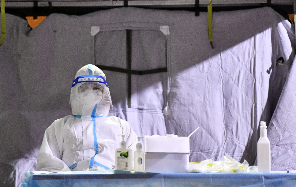 凌晨1点半左右,采访结束后路过家附近的一处核酸检测点,长长的队伍已经不见踪影,那些“大白”们却还在原地坚守待命。此时,我从远处看到一位医务人员坐在靠椅上一动不动,长焦推过去之后,才看清她双目紧闭,可能是在睡觉,也可能只是短暂的闭目养神。不忍心前去打扰的我在远处按下了快门,当然也并没有询问她的名字,以至于在写图片说明时,只能遗憾地用“一名医务人员”代替了。“致所有顶天立地却又平凡普通的……无名的人啊 我敬你一杯酒”正如毛不易在歌曲《无名的人》的歌词一样,只能以此歌聊以慰藉了。