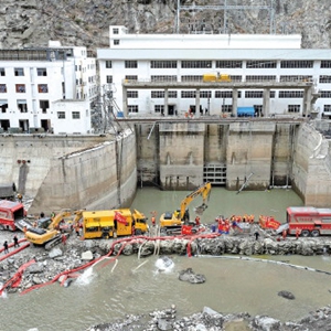 1月13日,救援人员用机械抽出丹巴县章谷镇三岔河关州电站厂的积水。 新华社记者沈伯韩摄