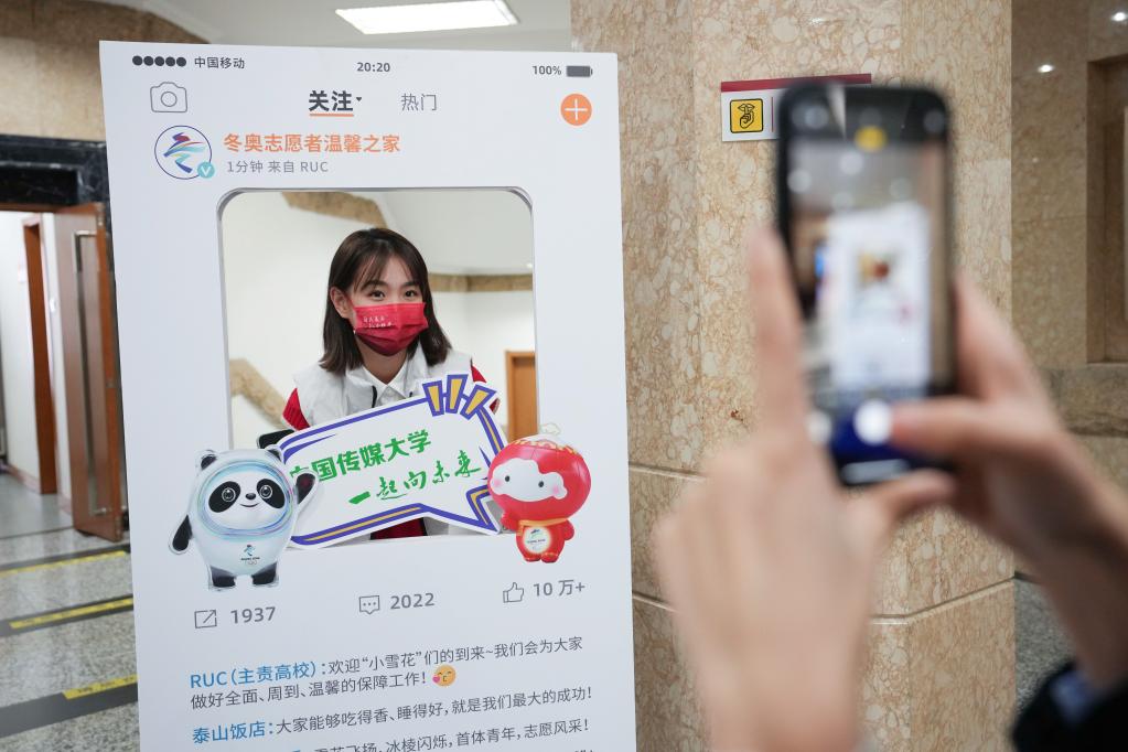 中国传媒大学的志愿者在场馆培训营开班仪式后与宣传板合影留念。新华社记者 鞠焕宗 摄