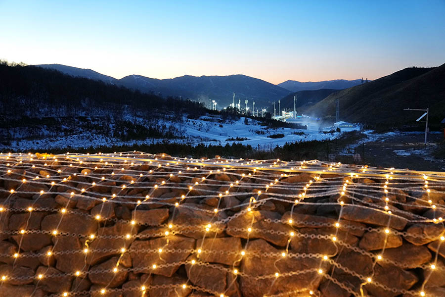 这是2021年12月30日拍摄的崇礼长城景观展示亮化工程现场,远处为国家越野滑雪中心。新华社记者 牟宇摄