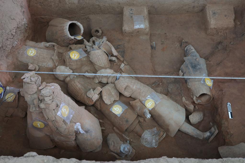 据了解,这次发掘出土了一件将军俑和一件中级军吏俑。考古工作者通过梳理秦俑坑发现以来所出土的中、高级军吏俑,特别是一号坑所出土的中、高级军吏俑,提出一号坑的军阵排列可能具有南北、东西向对称的特点,这次发现对了解、研究整个一号坑的军阵排列具有重要意义。