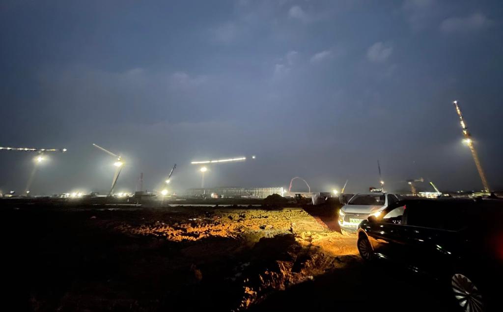 下塘镇李岗村西侧,太阳已落山,中创新航合肥基地项目工地上灯火闪耀,机器轰鸣。“2021年底,这里还是荒地,到现在主体厂房已经开工建设。”下塘镇经发局办事员马帅说,下塘工业园区的每一天都是新的。