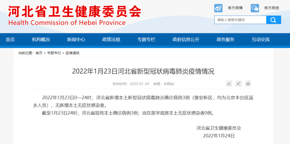 2022年1月23日0—24时,河北省新增本土新型冠状病毒肺炎确诊病例3例(雄安新区,均为北京丰台区返乡人员),无新增本土无症状感染者。