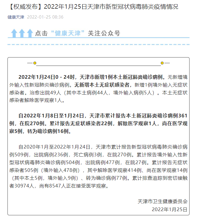 【权威发布】2022年1月25日天津市新型冠状病毒肺炎疫情情况
