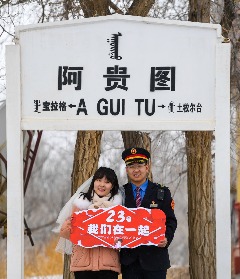 裴召勇的未婚妻张芳是包头货运中心大牛地车间的货运员,两人工作地点相距约600公里,平时聚少离多。“23日”对裴召勇和张芳来说,意义非同一般。他俩的生日都是在23日,相识也是23日,原本计划在2021年10月23日举办婚礼,但由于疫情和工作原因,他们的婚礼无奈推迟。今年春节裴召勇和张芳都要值班。为了能和裴召勇有一次短暂的相聚,倒休的张芳决定1月23日前往阿贵图站为裴召勇送去温暖和爱意。