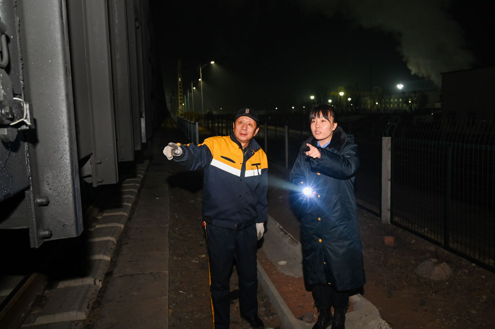 ↑1月20日,在包头货运中心大牛地车间,张芳(右)和同事在查看货运列车情况。