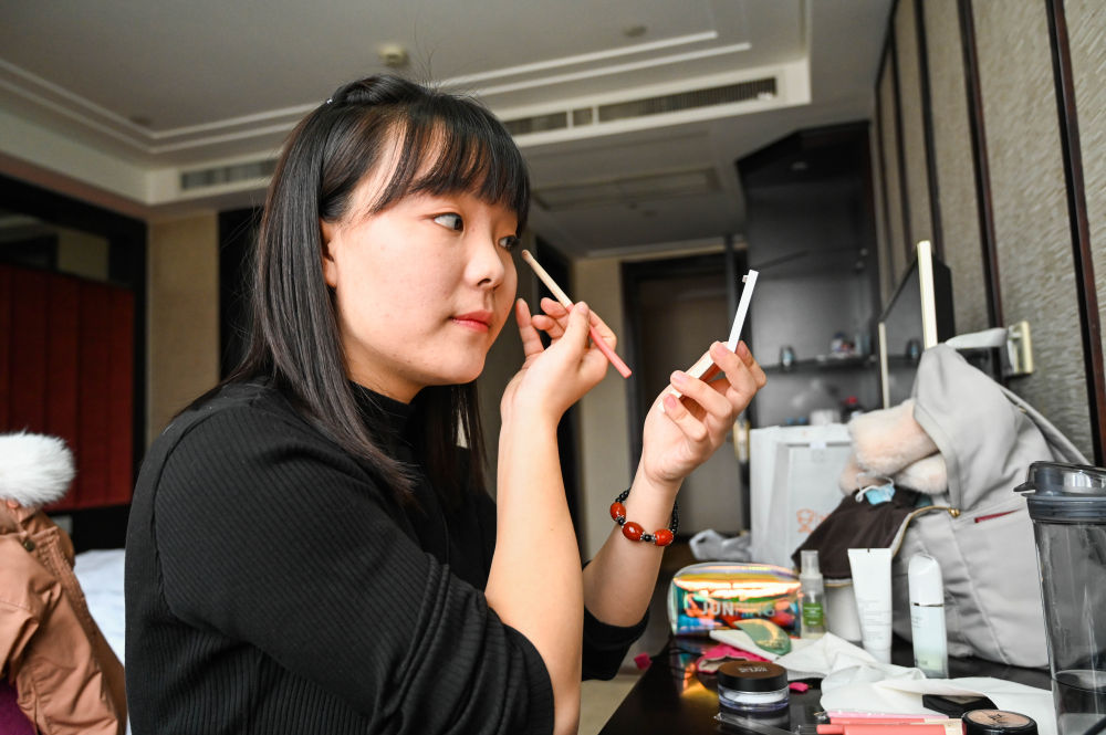 ↑1月23日早,在乌兰察布市集宁区酒店休息一晚后,张芳化妆准备去看望未婚夫裴召勇。