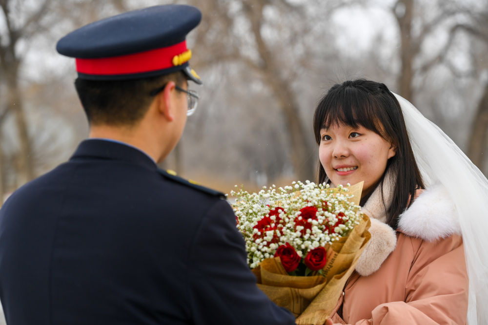 ↑1月23日,张芳(右)手捧鲜花、戴着白色头纱出现在裴召勇面前。