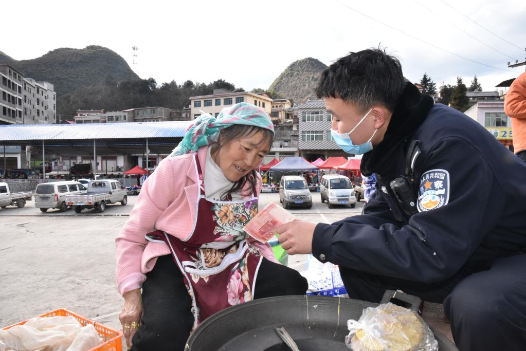 “珠市乡与10余个乡镇接壤,人口流动量大,市场交易频繁,过年更是如此。”杨谨华说。走到一处卖荞麦饼的摊位前,他俯下身来,掏出一张崭新的钞票,给几位上了年纪的摊主宣传如何防伪钞。