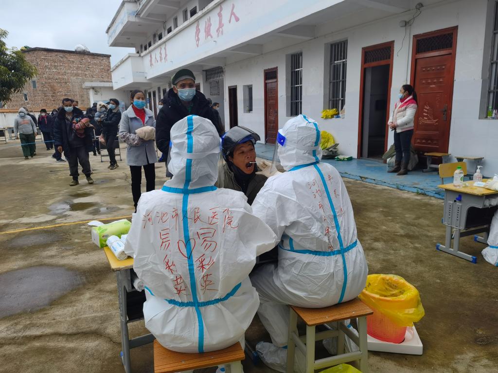 前来支援百色的医务人员为农村地区群众提供核酸采样服务。(广西河池市人民医院供图)