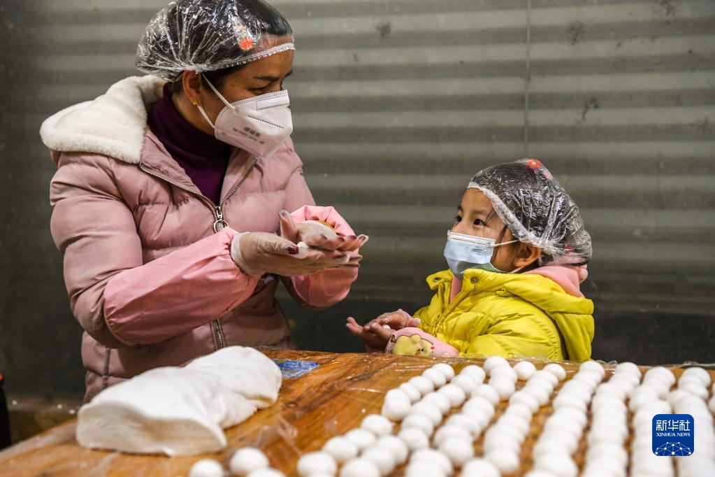 2月14日,广西德保县城关镇莲城社区居民黄荣算(左)与女儿一起制作手工汤圆。新华社记者 曹祎铭 摄