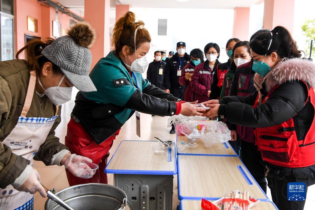 2月15日,广西德保县城关镇莲城社区工作人员黄佩妮(左二)和志愿者一起为抗疫一线的工作人员送汤圆。新华社记者 曹祎铭 摄