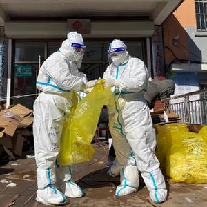 2月15日,在绥中县的一个封控社区,身着防护服的工作人员在处理医疗垃圾。新华社记者李昂 摄