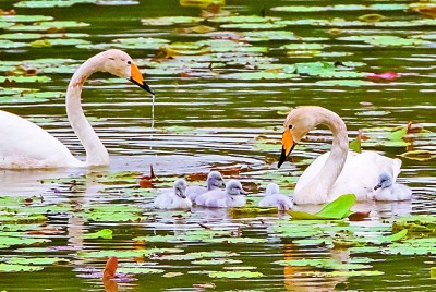 天鹅夫妇“美峡”和他们的孩子“三门峡籍”天鹅宝宝生活在天鹅湖畔 杜杰摄/光明图片