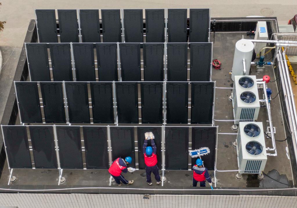 图为国网重庆城口供电公司庙坝供电所员工正在清理“热宝宝”聚热板。(牟丹阳 摄)
