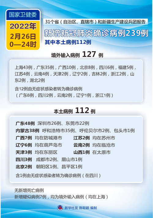 新华社北京2月27日电 国家卫生健康委员会27日通报,2月26日0-24时,31个省(自治区、直辖市)和新疆生产建设兵团报告新增新冠肺炎确诊病例239例。其中境外输入病例127例(上海43例,广东35例,广西10例,北京8例,四川6例,福建5例,江苏4例,云南4例,天津2例,辽宁2例,吉林2例,浙江2例,山东2例,湖北2例),含12例由无症状感染者转为确诊病例(广东6例,四川2例,云南2例,辽宁1例,浙江1例);本土病例112例(广东48例,其中深圳市26例、东莞市22例;内蒙古38例,其中呼和浩特市35例、呼伦贝尔市2例、包头市1例;广西7例,均在防城港市;辽宁6例,均在葫芦岛市;天津3例,均在东丽区;四川3例,其中成都市2例、眉山市1例;北京2例,其中朝阳区1例、昌平区1例;江苏2例,均在苏州市;云南2例,均在临沧市;山西1例,在太原市),含1例由无症状感染者转为确诊病例(在四川)。无新增死亡病例。新增疑似病例7例,均为境外输入病例(均在上海)。
