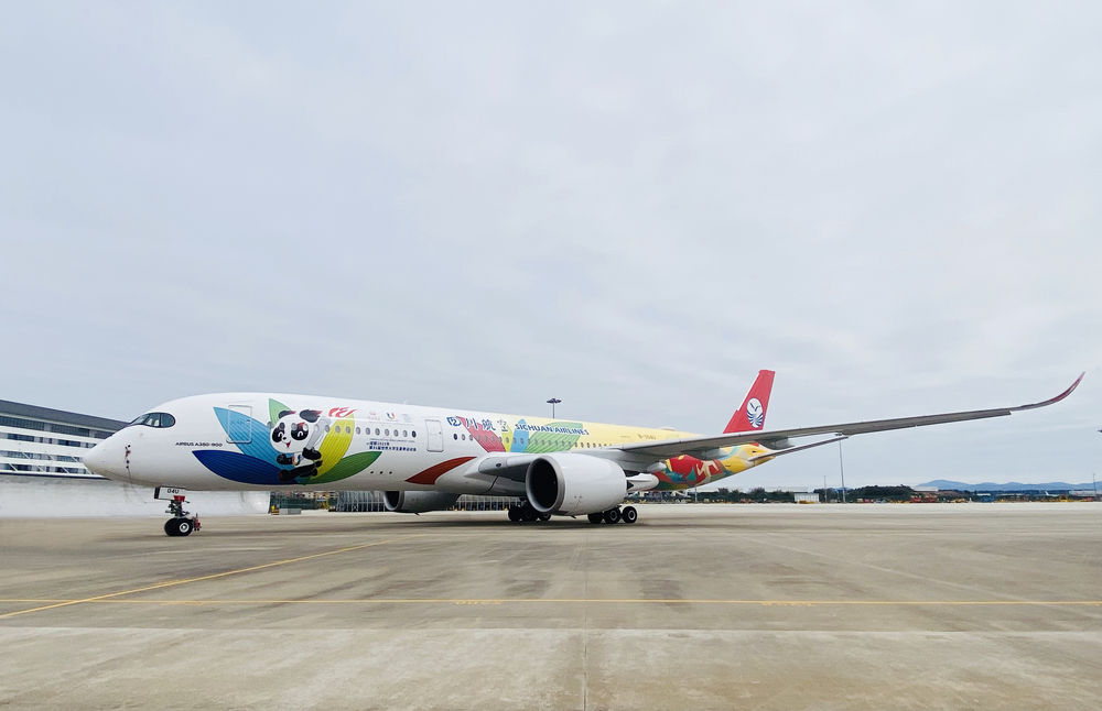 川航为成都世界大学生夏季运动会量身打造的首架 A350“大运号”主题涂装飞机(四川航空供图)
