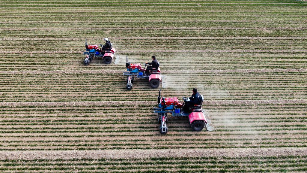 2月17日,山东省聊城市莘县妹冢镇农民在麦田里进行镇压保墒作业(无人机照片)。新华社记者郭绪雷 摄