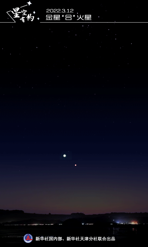 新华社天津3月10日电(记者周润健)继3月2日太阳系的两颗行星——水星和土星“同框”后,3月12日,太阳系的另外两颗行星——金星和火星也要“同框”了。天文科普专家表示,金火“同框”的视觉效果明显要好于水土“同框”,如果天气晴好,大气透明度高,这幕趣味天象有望用肉眼能观测到。
