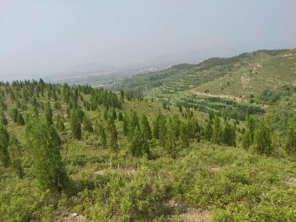 登上吴家山,一片绿色映入眼帘:脚下侧柏苍翠挺拔,黄栌、榛子等点缀其间。极目远眺,连绵的山头郁郁葱葱。
