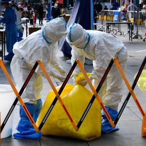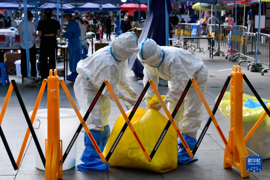3月13日,在深圳罗湖区东门广场核酸检测点,医务人员在处理医用垃圾。新华社发(储焱摄)