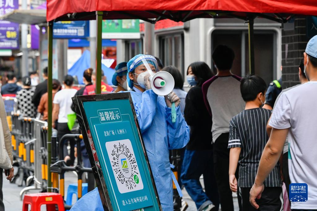 3月13日,在深圳罗湖区东门广场核酸检测点,志愿者在引导居民。新华社发(储焱摄)