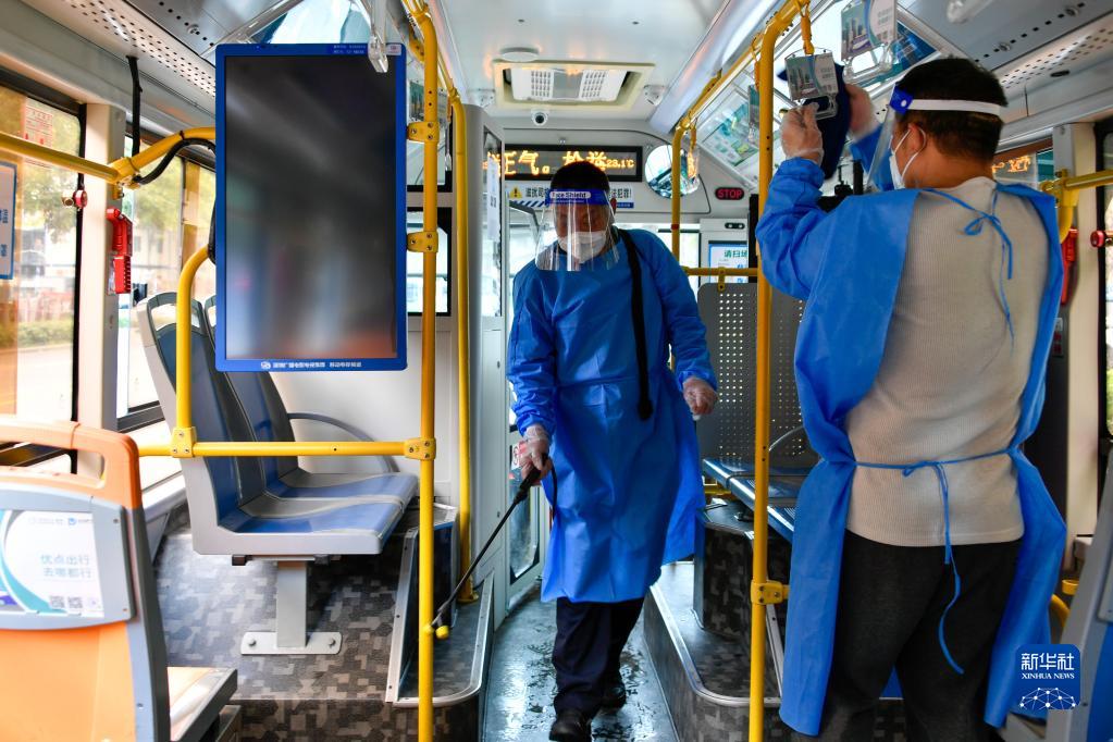 3月13日,深圳福田区下沙总站工作人员对公交车进行消杀。新华社发(储焱摄)