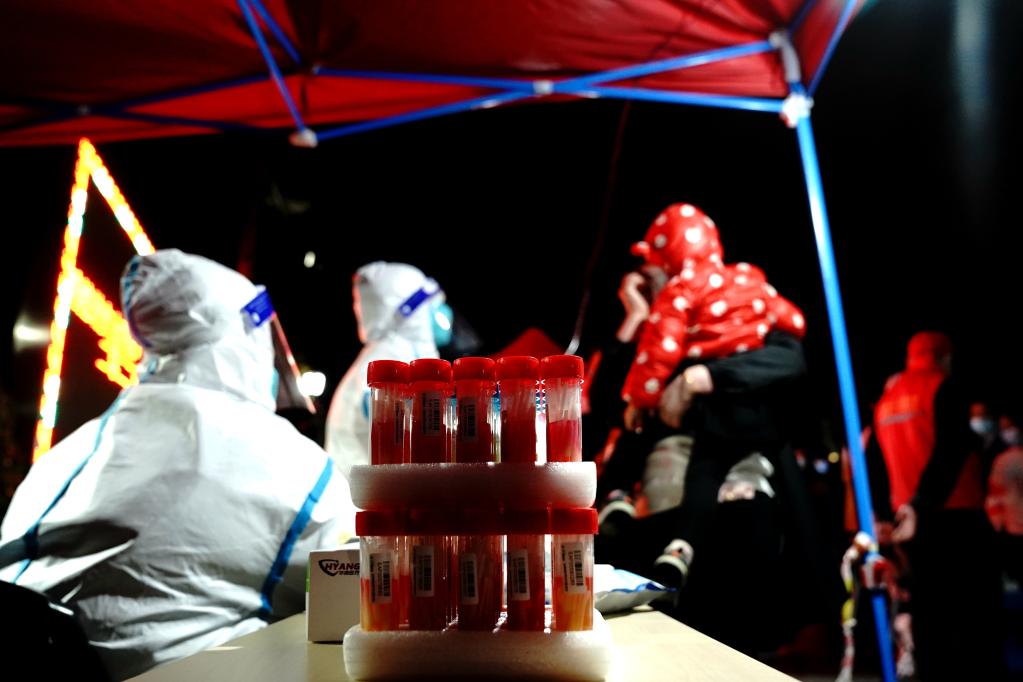 3月13日凌晨,上海市松江区洞泾镇社区卫生服务中心的医护人员在中海悦庭小区进行核酸采样。新华社记者张建松摄