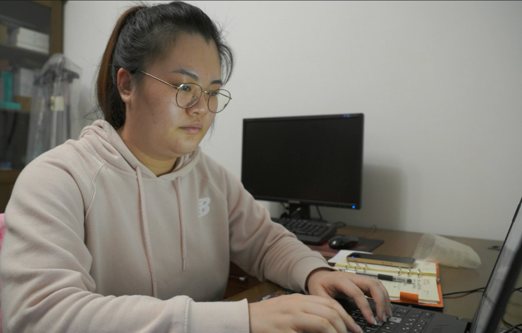 赵宁珊通过电脑在线上为被隔离的社区居民“答疑解惑”。(嘉定区融媒体中心供图)