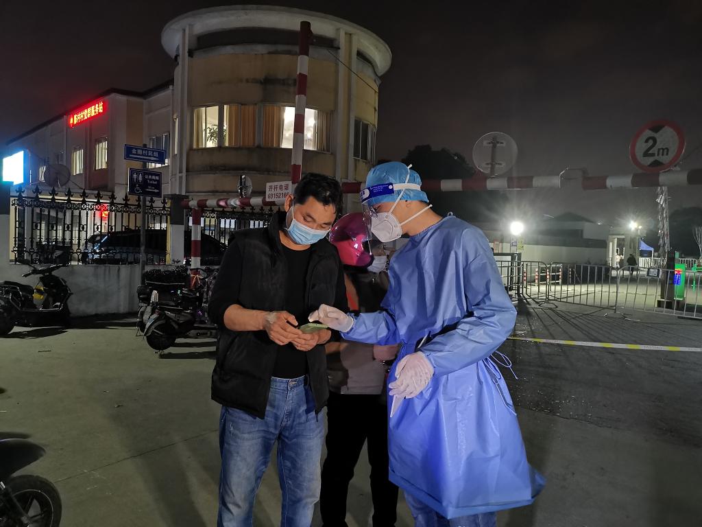 李俊文在核酸检测点为居民服务。(嘉定区融媒体中心供图)