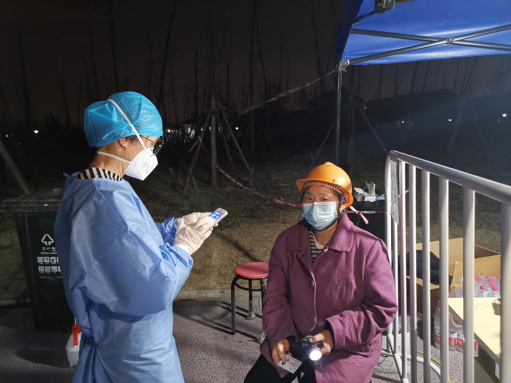 3月13日晚上8点,在上海嘉定区马陆镇包桥村的核酸检测点,身为党员的赵燕身着蓝色防护服,正耐心地用自己的手机,给70岁的村民吴阿姨录入核酸检测信息。
