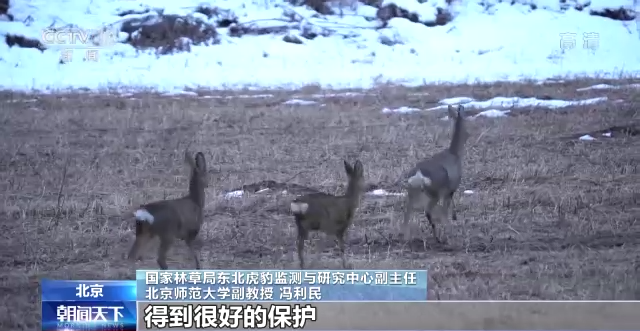 国家林草局东北虎豹监测与研究中心副主任 北京师范大学副教授 冯利民:保护区内这个生态系统、野生动物的生存环境,得到很好的保护,人为活动的情况非常的少。所以这样的话,干扰到豹正常活动的因素都非常的少,所以为豹的生存提供了非常安全的一些环境,所以我们才能看得到,我们的相机才能记录到这只豹能够在一个地点,一整天待在这个地方,安全的进食玩耍这样的过程。