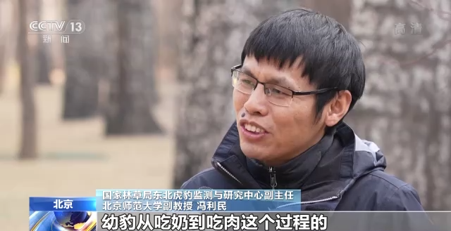 国家林草局东北虎豹监测与研究中心副主任 北京师范大学副教授 冯利民:我们这一次拍摄这样的场景,正好完全记录到了幼豹从吃奶到吃肉这个过程的过渡的阶段,这样的视频对于野生豹生活中重要阶段的野外记录,以前非常的少,在中国也是首次。