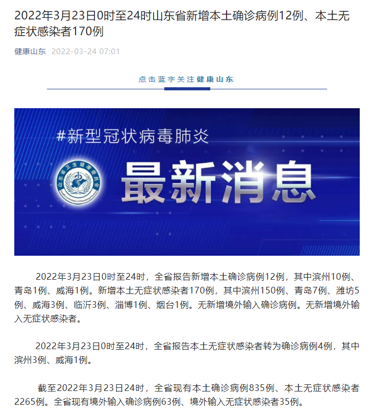 原标题:2022年3月23日0时至24时山东省新增本土确诊病例12例、本土无症状感染者170例