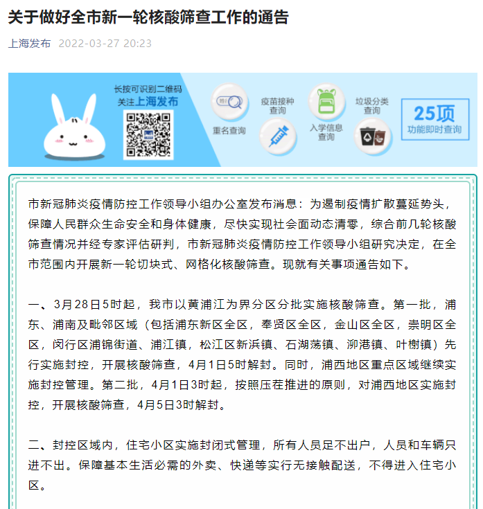 一、3月28日5时起,我市以黄浦江为界分区分批实施核酸筛查。第一批,浦东、浦南及毗邻区域(包括浦东新区全区,奉贤区全区,金山区全区,崇明区全区,闵行区浦锦街道、浦江镇,松江区新浜镇、石湖荡镇、泖港镇、叶榭镇)先行实施封控,开展核酸筛查,4月1日5时解封。同时,浦西地区重点区域继续实施封控管理。第二批,4月1日3时起,按照压茬推进的原则,对浦西地区实施封控,开展核酸筛查,4月5日3时解封。