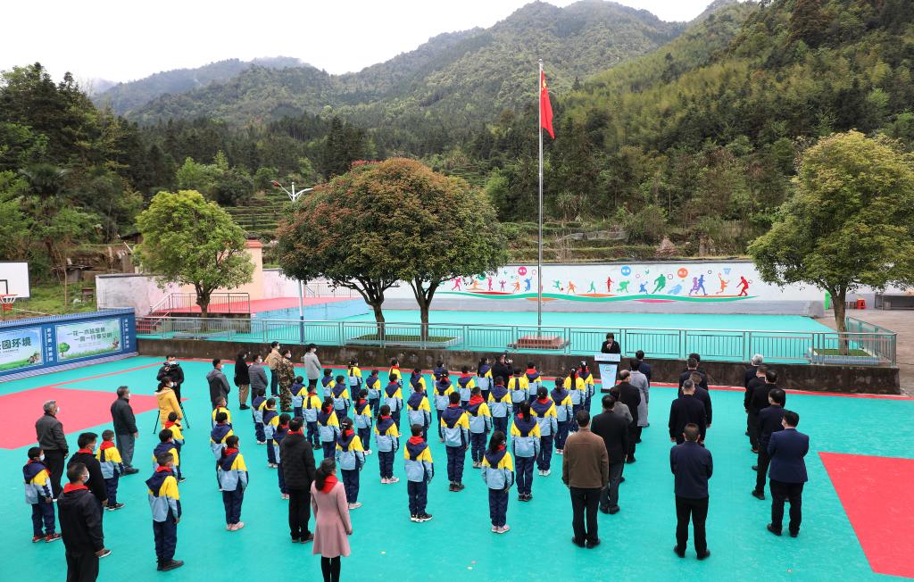3月28日,大源镇桥头小学的师生参加新校园首个升旗仪式。新华社记者 王瑞平 摄