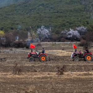 扎西岗村海拔3100多米,全村44户214人,祈求粮食丰收的春耕仪式,是当地重要的民俗活动。只见一台台挂着五星红旗和洁白哈达的拖拉机,缓缓驶入田间。白玛才旺换上节日的盛装,发动拖拉机加入春耕仪式的队伍。