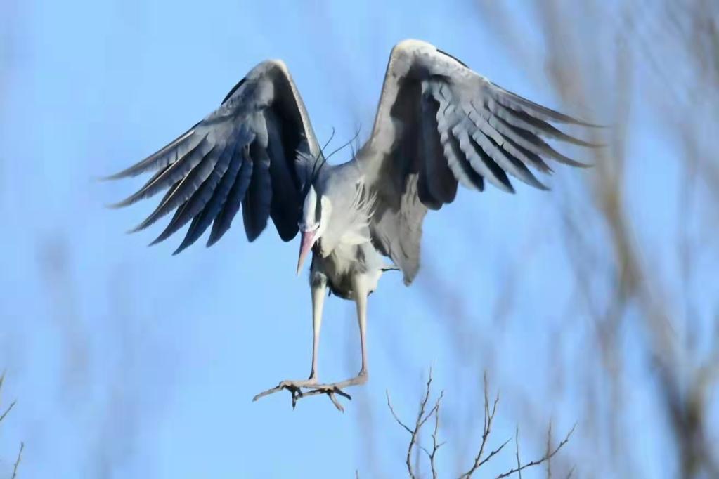 一只正准备落在树枝的苍鹭。(受访者供图)