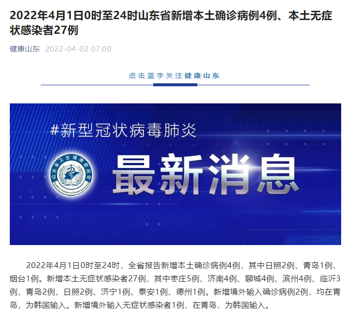2022年4月1日0时至24时山东省新增本土确诊病例4例、本土无症状感染者27例