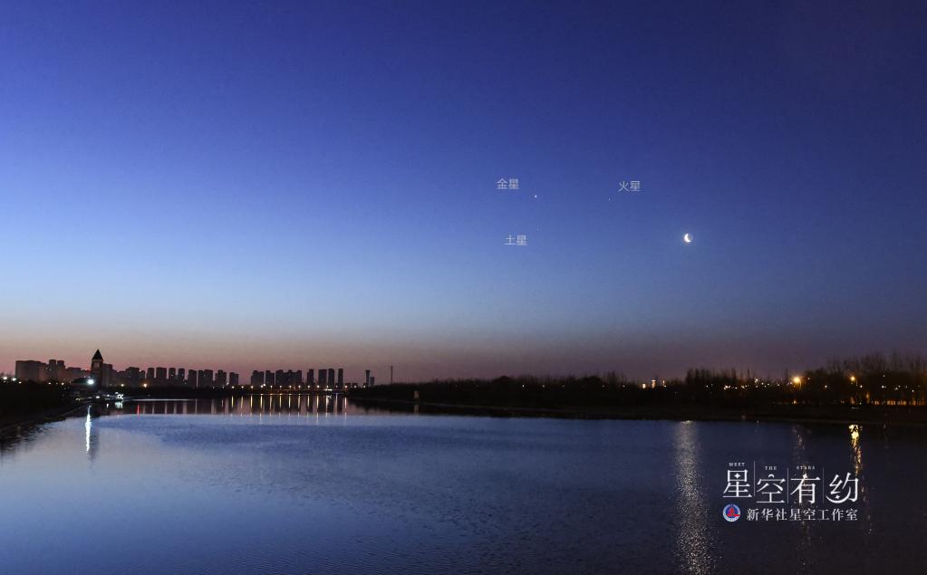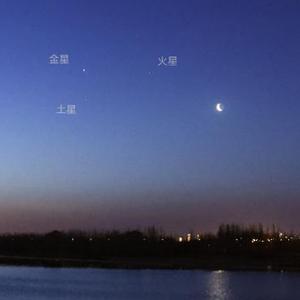 这是天津市天文爱好者杨婧2022年3月28日清晨在天津拍制的金星、火星、土星与残月。(本人供图)