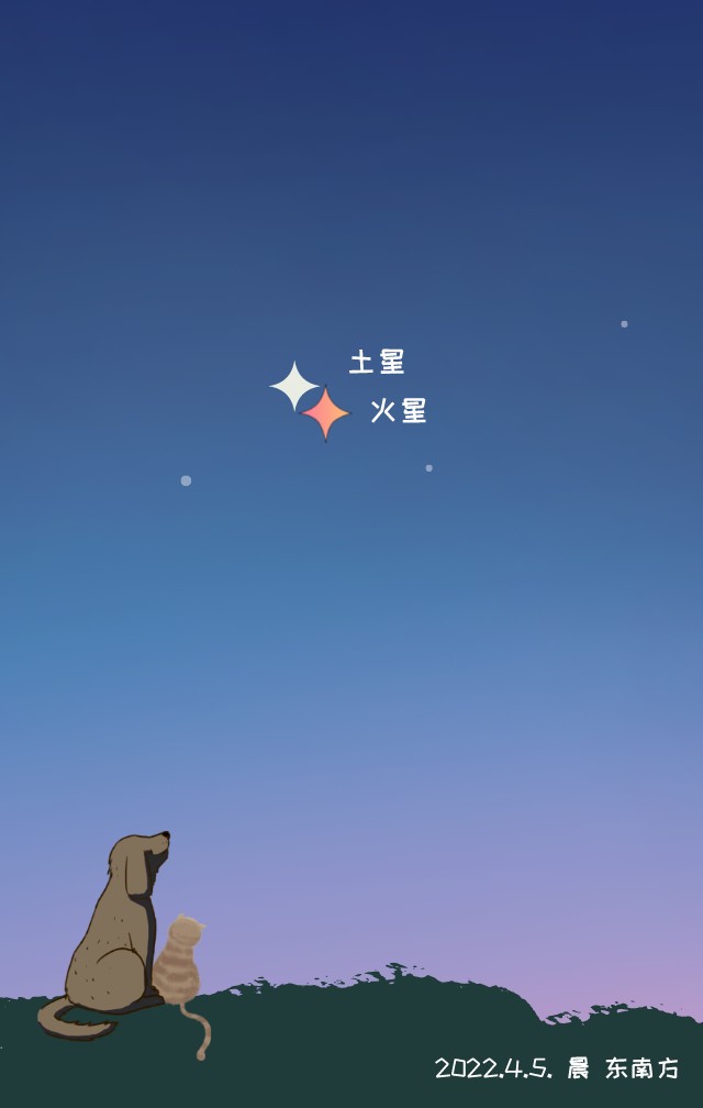 在今年3月底的时候,金星、火星和土星在凌晨的东南方低空中相聚在一起;到了4月初,金星渐行渐远,而火星和土星则越靠越近。