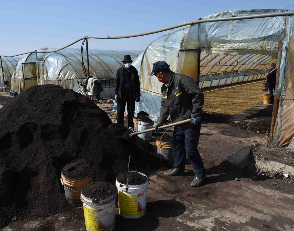 4月2日,在友好村乌拉巴街屯,村民正在将土运进大棚。新华社记者 梁书斌 摄