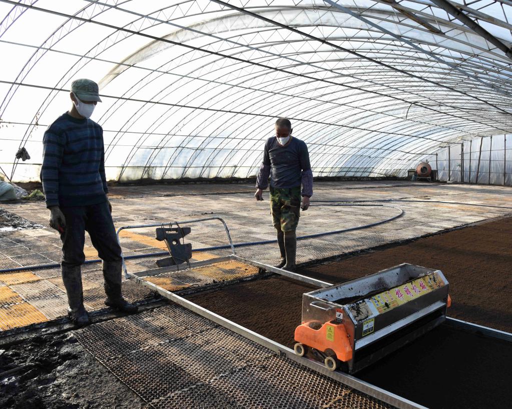 4月2日,在胜远村二屯,村民在用自动覆土机给苗床覆土。新华社记者 梁书斌 摄