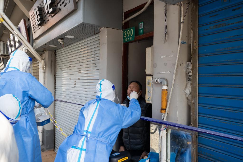 广福居委会工作人员正在给从二楼下来的张永生做抗原检测。新华社记者 金立旺 摄